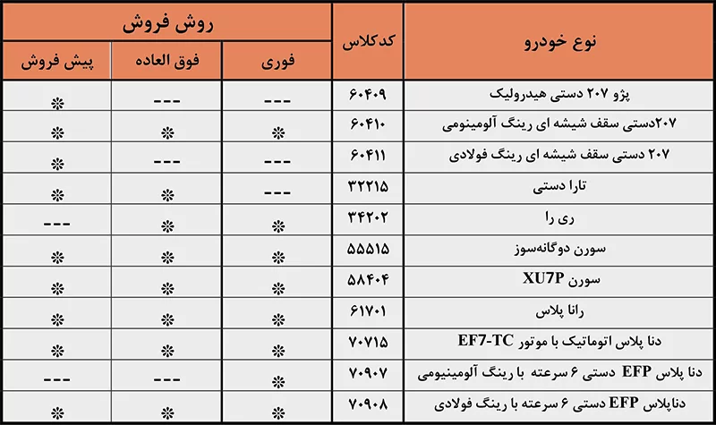 ۲۰۷ دستی سقف شیشهای رینگ آلومینیومی، ری را، سورن دوگانه سوز،سورن XU7p، رانا پلاس، دناپلاس اتوماتیک با موتور EF7-TC، دناپلاس EF7 دستی ۶ سرعته با رینگ آلومینیومی و فولادی به صورت فروش فوری عرضه میشوند. در این طرح نیازی به بلوکه کردن حساب نبوده و متقاضیان سه طرح عادی، مادران و فرسوده امکان شرکت در این طرح را دارند. این طرح از روز پنجشنبه ۱ آبان ماه آغاز شده و تا روز سه شنبه ۶ آبان ادامه دارد. متقاضیان برای شرکت در این شرایط فروش ایران خودرو میتوانند به سایت ikcosales.ir مراجعه کنند.