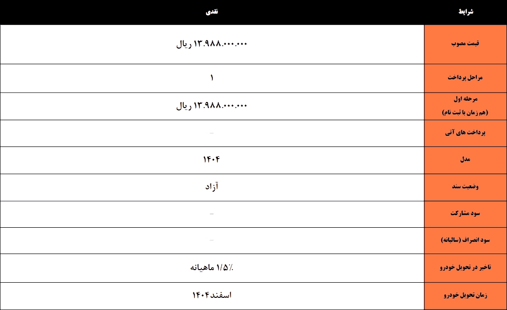 نحوه واریز وجه نقدی و تکمرحلهای است و زمان تحویل خودرو اسفندماه ۱۴۰۴ خواهد بود. سایر اطلاعات این طرح را در جدول زیر مشاهده کنید.