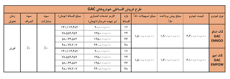 در حال حاضر آرتابان موتورز و راسا موتور شرکتهای واردکننده خودرو در ایران است که خدمات فروش برند گک یا همان جی ای سی (GAC) را ارائه میدهد. در حال حاضر چندین خودروی هیبرید و عادی از مدلهای اصلی برند جی ای سی با نامهای امپو و امکو در ایران موجود و آماده ارائه به متقاضیان است. در این صفحه میتوانید آخرین شرایط فروش محصولات آرتابان موتورز را مشاهده و مطالعه کنید.