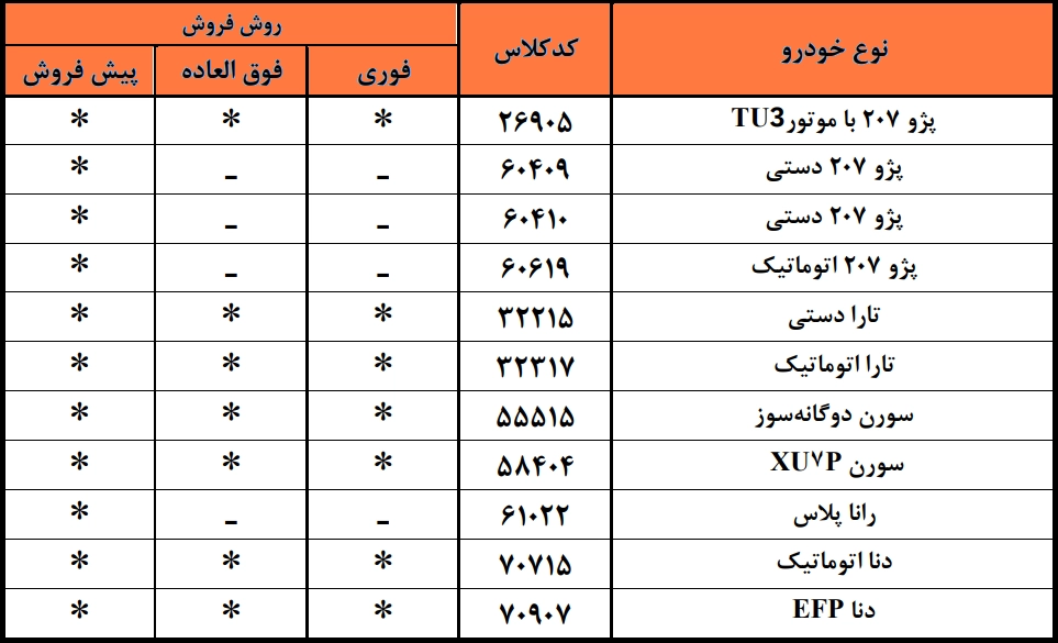 نوع خودرو | کدکلاس | روش فروش (فوقالعاده) | روش فروش (پیشفروش) |