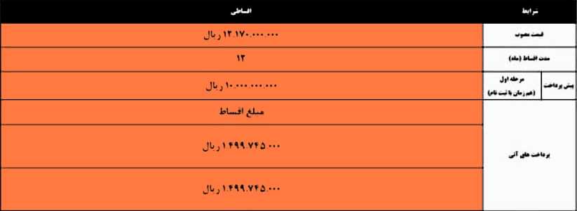 مشتریان طرح اقساطی در مرحله آخر و بعد از پرداخت آخرین قسط باید برای شرایط ۱۸ماهه ۷۵۰ میلیون تومان و برای شرایط ۲۴ماهه ۷۰۰ میلیون تومان را به حساب شرکت واریز کنند.