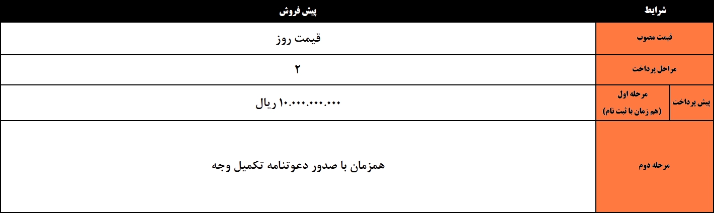 شرایط فروش شامل قیمت روز بوده و برای مشتریان سود مشارکت ۲۴ درصد و سود انصراف ۲۰ درصد در نظر گرفته شده است.