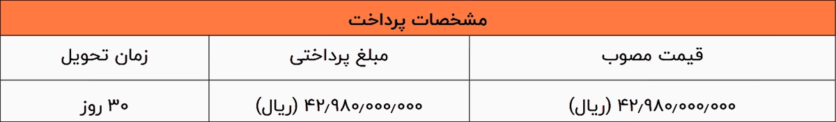 قیمت مصوب برای خرید نقدی ۳,۰۹۸,۰۰۰,۰۰۰ تومان تعیین شده است و تحویل خودرو ظرف ۳۰ روز کاری خواهد بود.