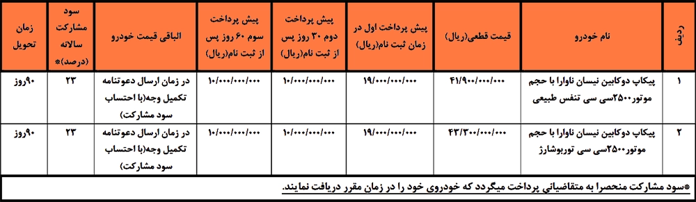 در بخش بعدی، میتوانید جدیدترین شرایط فروش نیسان ناوارا کریمان موتور را مشاهده کنید.