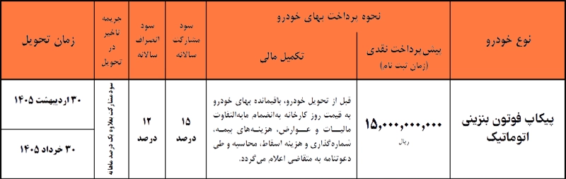 این خودرو با قیمت قطعی ۲ میلیارد و ۹۷۰ میلیون تومان عرضه میشود و زمان تحویل آن هفته آخر دیماه ۱۴۰۴ خواهد بود که در صورت ایجاد هرگونه تاخیر در تحویل، سود مشارکت به اضافه ۱٪ ماهیانه به متقاضی پرداخت خواهد شد. همچنین شرایط فروش فوق با سود مشارکت ۱۵٪ (سالیانه) و سود انصراف ۱۲٪ (سالیانه) عرضه میشود. سایر اطلاعات این خودرو را میتوانید در جدول زیر مشاهده کنید.